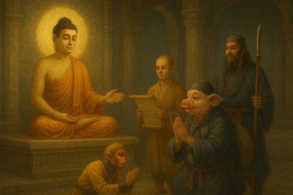 Setelah melewati 81 cobaan, mereka akhirnya tiba di Kuil Thunderclap di India, tempat Buddha Tathagata tinggal. Buddha menyambut mereka dengan senyum hangat dan berkata, “Kalian telah menempuh perjalanan panjang bukan untuk mencari kitab, tapi untuk menemukan kebijaksanaan di dalam hati.”