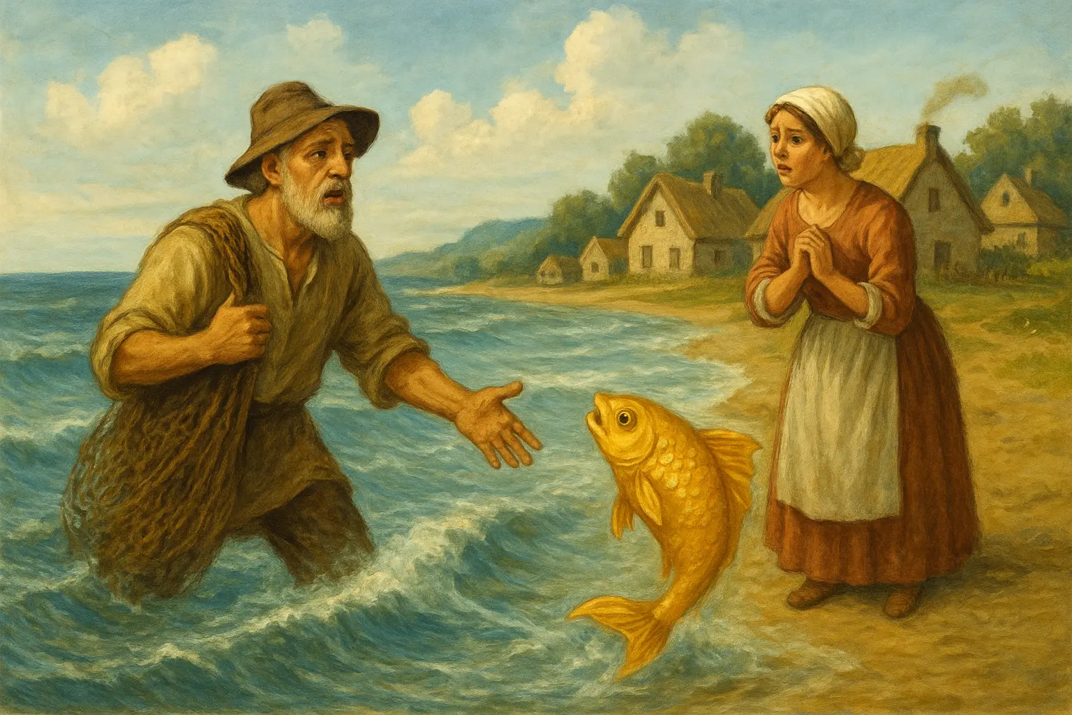 Pada zaman dahulu kala, di sebuah desa kecil di tepi laut, hiduplah seorang nelayan miskin bersama istrinya. Mereka tinggal di dalam gubuk reyot yang berdinding anyaman bambu dan beratap jerami. Setiap pagi, si nelayan pergi ke laut membawa jala tuanya yang mulai usang, berharap bisa menangkap cukup ikan untuk dimakan hari itu. Sementara itu, istrinya tinggal di rumah, menambal pakaian, menjerang air, atau sekadar menatap laut dari jendela, bermimpi suatu hari mereka bisa hidup lebih baik.